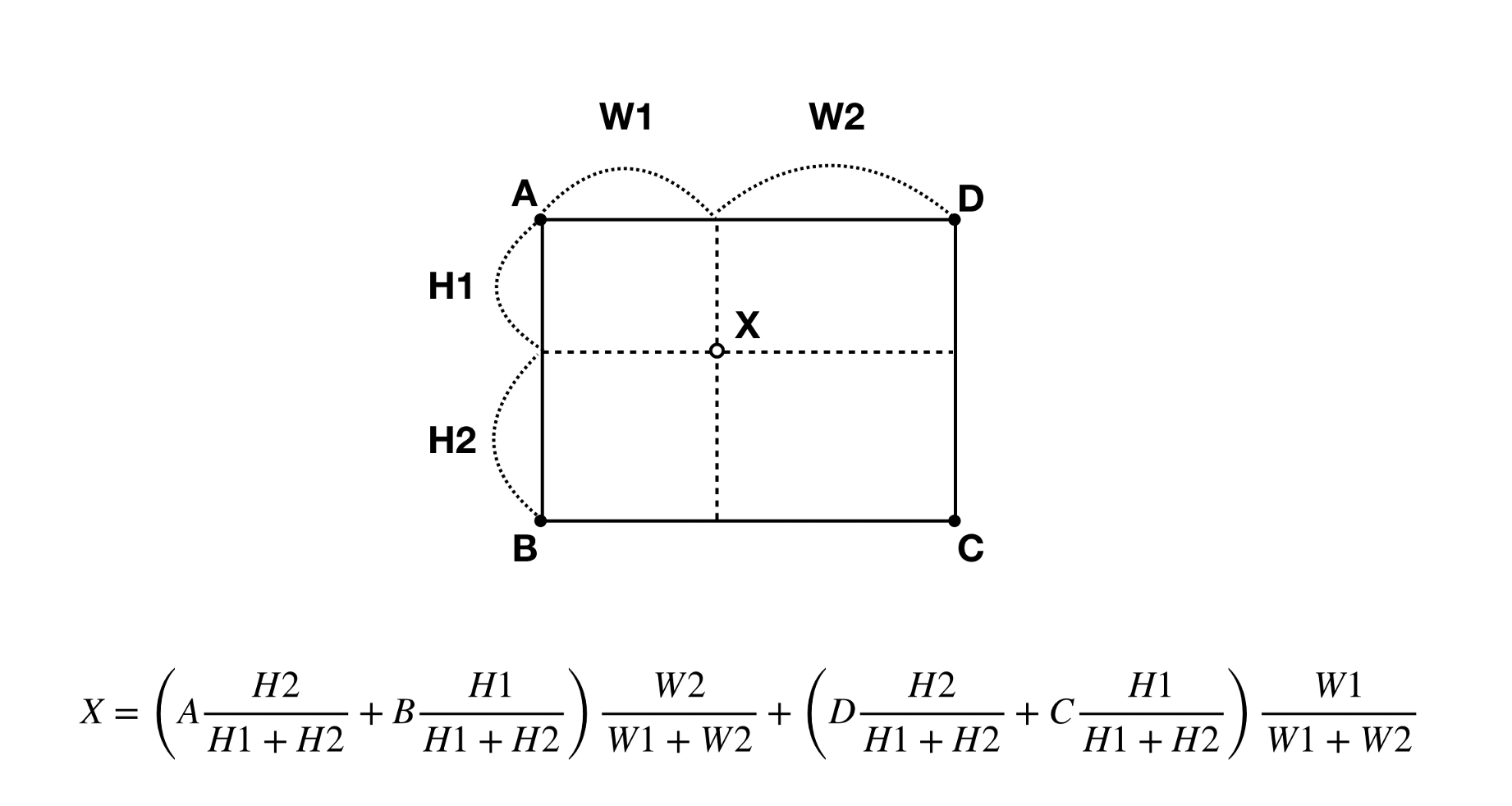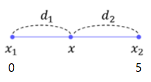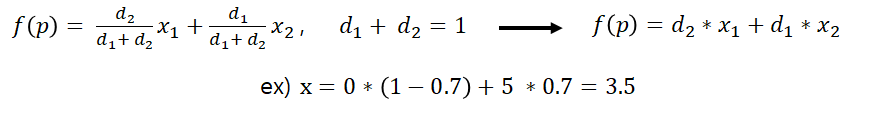x1에 d2(x에서 x2까지의 거리 값)를 가중치로 곱한 값과 x2에 d1(x1에서 x까지의 거리 값)을 가중치로 곱한 값을 더하면 사이에 위치한 값을 구할 수 있습니다.